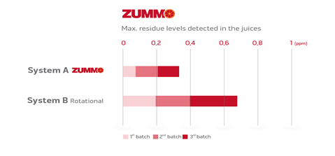 According to a recent study performed by the Research and Technological Centre for the Food Sector, AINIA, Zummo vertical squeezing system obtains orange juice with significantly lower levels of chemicals residues.